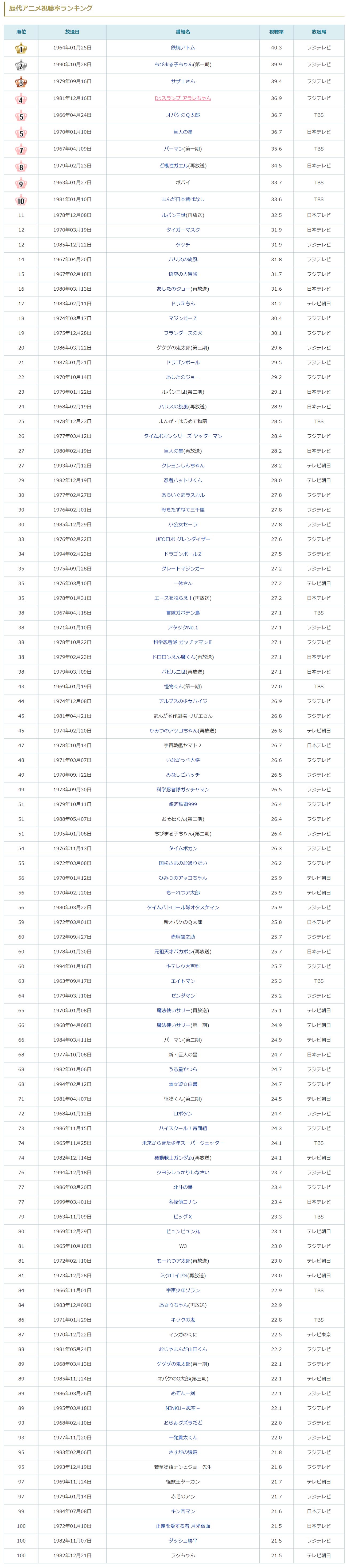 歴代アニメ視聴率ランキング